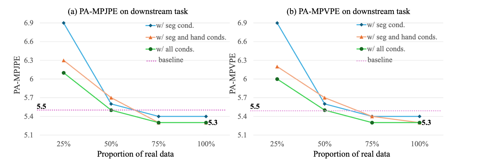 Data augmentation analysis with varying ratios of real data. We augment different portions of the DexYCB training set (25%, 50%, 75%, 100%) with our generated synthetic data. The baseline (dashed line) indicates performance when training solely on 100% of the real DexYCB data without synthetic augmentation.