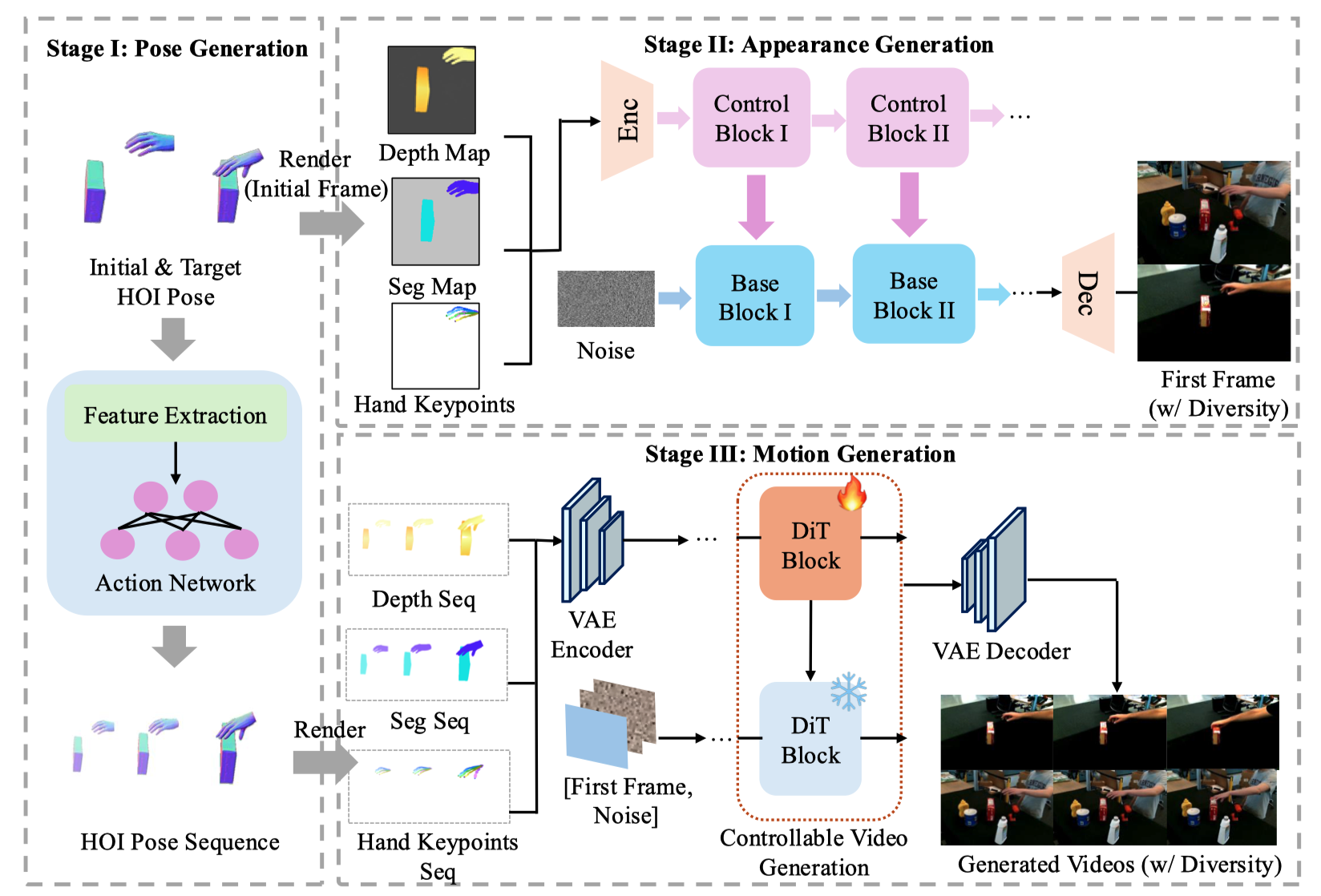 Overview of our three-stage generation pipeline. (1) Pose Generation: A pretrained pose generation model generates the intermediate hand-object interaction (HOI) poses based on the initial and target poses, along with the object mesh. (2) Appearance Generation: A controllable image diffusion model synthesizes the first frame of the video, conditioned on multi-modal inputs (depth maps, semantic masks, and keypoint annotations). (3) Motion Generation: The generated HOI sequence and the first frame are rendered into a full video sequence by a video diffusion model, conditioned on the same multi-modal inputs used in the appearance generation stage.